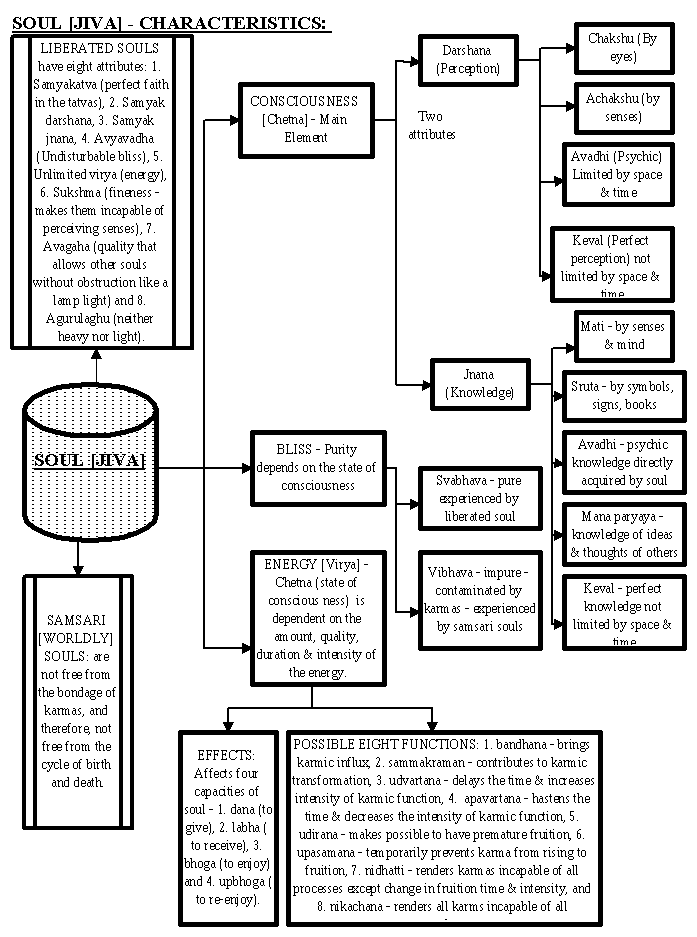 From realistic point of view (Nischaya Naya), Jiva is distinguished by its own great quality, consciousness. Jiva is Ätmä (soul) and has three characteristics; a) consciousness, b) bliss and c) energy. The body, blood, bones, skins, etc. are not the part of the soul (Jiva), They are Ajivas because They do not have consciousness. Anything that does not have consciousness is Ajiva. The consciousness is the central quality of soul. The soul has the capacity to experience unlimited consciousness, unlimited bliss and unlimited energy, and once this state is achieved - the soul is liberated. As we have relationship with many things like food, cloth, employment, money, shelter, companionship, etc., the state of the soul can be transitorily associated with other substances.