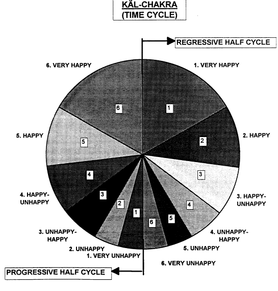 Jains believe that time is infinite, without any beginning or end. Time is divided into infinite equal time cycles (Kälchakras). Every time cycle is further sub-divided in two equal halves. The first half is the progressive cycle or ascending order, called Utsarpini. The other half is the regressive cycle or the descending order, called Avasarpini. Every Utsarpini and Avasarpini is divided into six unequal periods called Äräs. During the Utsarpini half cycle, development, happiness, strength, age, body, religious trends, etc. go from the worst conditions to the best. During the Avasarpini half cycle, development, happiness, strength, age, body, religious trends, etc. go from the best conditions to the worst. Presently, we are in the fifth Ärä of the Avasarpini phase. When the Avasarpini phase ends the Utsarpini phase begins. Thus Kälchakra goes on repeating and continues forever. The six Äräs of Avasarpini are called:: (1) Susham Susham (very happy), (2) Susham (happy), (3) Susham Dusham (happy-unhappy), (4) Dusham Susham (unhappy-happy), (5) Dusham (unhappy) and (6) Dusham Dusham (very unhappy). The Äräs in Utsarpini are in the reverse order.